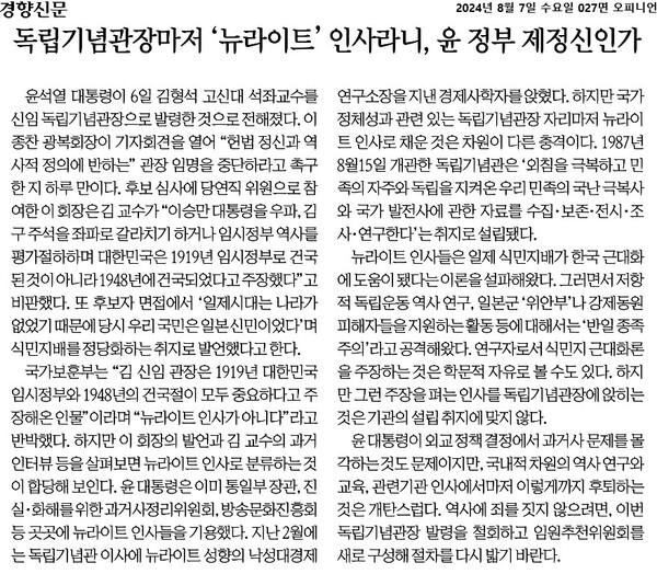 경향신문도 7일 “독립기념관장마저 ‘뉴라이트’ 인사라니, 윤 정부 제정신인가” 제목의 사설에 이어 9일에도 “역사교육 기관장 뉴라이트로 채우는 정부 역주행 멈추라” 제목의 사설을 냈다. 경향은 김낙년 한국학중앙연구원장, 이배용 국가교육위원장, 김광동 진실화해를위한과거사정리위원장, 박지향 동북아역사재단 이사장 등 최근의 여러 뉴라이트 인사들에 대한 윤석열 대통령의 임명을 강하게 비판하고 “뉴라이트 인사 강행의 평지풍파가 일고 있다, 독립운동과 임시정부 역사를 축소·왜곡하려는 반역사적 인사를 멈춰야 한다”고 했다.