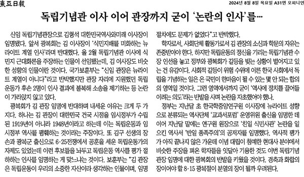 ‘조중동’으로 묶여 ‘친윤·어용·보수’ 매체로 분류되는 동아일보가 이번 사태에 비판적 논조를 보이고 있는 것도 눈에 띈다. 동아일보는 8일자 “독립기념관 이사 이어 관장까지 굳이 ‘논란의 인사’를” 제목의 사설에서, 광복회가 반발하고 있는 이유를 크게 ‘두 가지’로 설명하면서 “독립운동의 정신을 기리는 독립기념관 수장 인선을 놓고 정부와 광복회가 갈등을 빚는 상황이 벌어지고 있는 것은 유감”이라고 썼다. 또 “독립을 기념하는 일은 온 국민이 한마음이 될 수 있는 몇 안 되는 합의의 영역일 것이다. 그런 영역에서까지 굳이 ‘역사에 정치를 끌어들이려는 의도’라는 반발을 사며 논란을 자초했어야 했나”라고 지적했다.