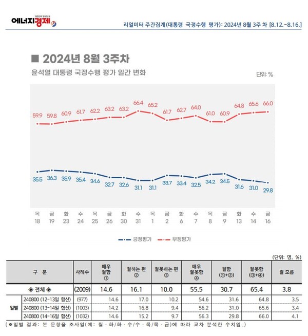 대통령 국정운영 지지도의 하락세는 ‘리얼미터’ 조사에서도 확연히 나타났다. <에너지경제신문> 의뢰로 12일~14일, 16일 4일 간 실시한 대통령 국정운영 평가 조사(전국 18세 이상 남녀 2009명, 표본오차 ±2.2%포인트, 신뢰수준 95%)에서 ‘긍정’평가 30.7%(‘매우 잘함’ 14.6% ‘잘 하는 편’ 16.1%)로 지난주보다 2.9% 하락했고, ‘부정’평가는 65.4%(‘잘못하는 편’ 10.0% ‘매우 잘못함’ 55.5%)였다. 일간 기준으로 광복절 다음날인 16일에는 29.8%를 기록했다.