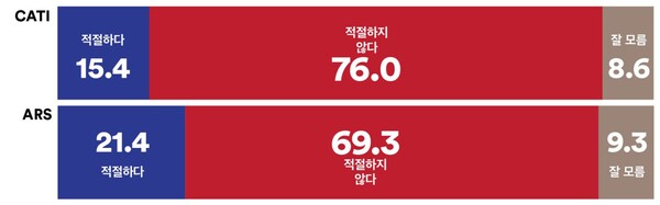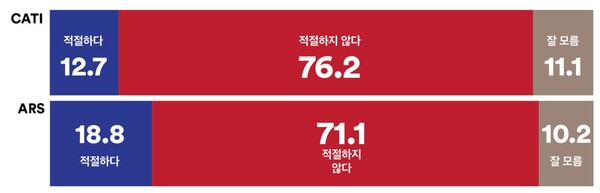 반면 ARS조사에서는 민주당 지지층과 조국혁신당 지지층은 10명 중 9명 이상이 ‘적절하지 않은 임명’이라 응답했지만 국민의힘 지지층은 ‘적절한 임명’ 59.6% 대 ‘부적절한 임명’ 19.6%, ‘잘모름’ 20.8%로 응답했다. 진보층 10명 중 9명 가까이는 ‘적절하지 않은 임명’이라고 응답했으나 보수층은 ‘적절한 임명’ 41.4% 대 ‘부적절한 임명’ 41.9%로 의견이 팽팽하게 갈렸다. 중도층은 ‘적절’ 17.1% 대 ‘부적절’ 74.7%로 응답해 57.6%p의 격차를 보였다.