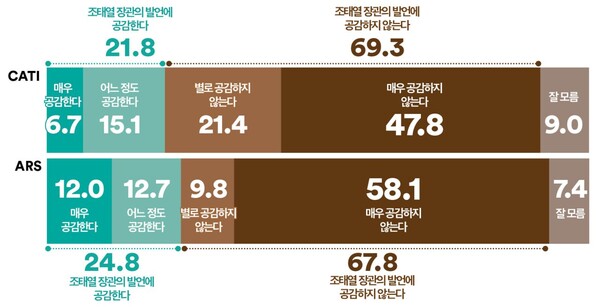 조선인 강제노역 현장인 일본 사도광산의 세계유산 등재 협상 과정에서 ‘강제성’ 표현이 빠진 것을 두고 야당이 굴종 외교라 지적하자 조태열 외교부 장관은 한풀이 하듯 등재에 반대해 자폭하는 것은 국익에 도움되지 않는다고 말한 것에 대한 조사에서는 전화면접조사 결과 조태열 외교부 장관의 발언에 ‘공감한다’ 21.8% 대 ‘공감하지 않는다’ 69.3%, ARS조사 결과 ‘공감한다’ 24.8% 대 ‘공감하지 않는다’ 67.8%로 집계됐다. 두 조사 모두 모든 지역, 모든 연령대, 남녀 모두에서 한풀이 하듯 등재에 반대하는 것은 국익에 도움되지 않는다고 한 조태열 외교부 장관의 발언에 ‘공감하지 않는다’고 응답했다. 민주당 지지층과 조국혁신당 지지층 각각 89.2%, 92.7%가 조태열 장관의 발언에 ‘공감하지 않는다’고 압도적으로 응답했고, 국민의힘 지지층은 ‘공감한다’는 응답(‘공감’ 51.9%, ‘비공감’ 35.5%)이 많았다. 무당층은 ‘공감’ 18.3% 대 ‘비공감’ 63.2%로 집계되어 44.9%p의 격차로 ‘공감하지 않는다’가 많았고, 진보층은 ‘공감’ 6.5% 대 ‘비공감’ 88.9%이었고, 보수층은 ‘공감’ 44.3% 대 ‘비공감’ 47.8%로 두 응답이 팽팽하게 갈렸다. 중도층은 ‘공감’ 20.2% 대 ‘비공감’ 72.9%로 조사되어 52.7%p의 격차로 ‘공감하지 않는다’는 응답이 우세했다. ARS조사에서는 민주당 지지층과 조국혁신당 지지층은 각각 89.9%, 91.8%로 ‘공감하지 않는다’고 응답했고 국민의힘 지지층은 70.0%가 ‘공감한다’고 응답해 지지정당에 따라 첨예하게 다른 답변을 보였다.