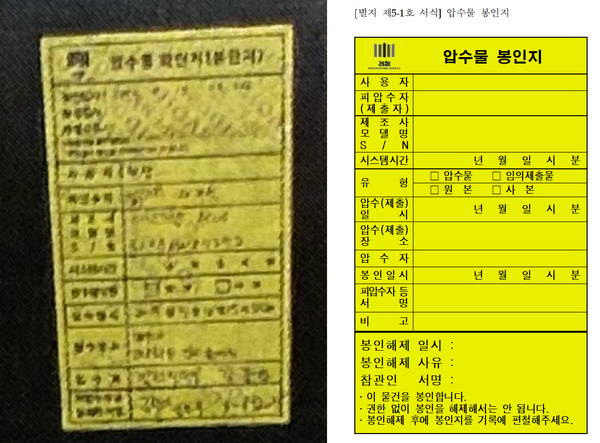 여기서는 봉인지 자체를 주목해보자. 아래 왼쪽 사진은 위 사진의 봉인지들 중 실질적으로 중요한 가운데 봉인지를 확대한 것이다. (이 하나의 봉인지는 앞서 언급한 디지털 증거 예규에서 별지로 규정된 것이고 나머지는 이 규정 봉인지가 변형된 것으로서 찾아본 바 마땅한 법규의 근거가 없다.) 한편 오른쪽은 이 PC들이 압수되던 당시인 2019년 9월에 시행 중이던 해당 예규의 봉인지 서식이다.