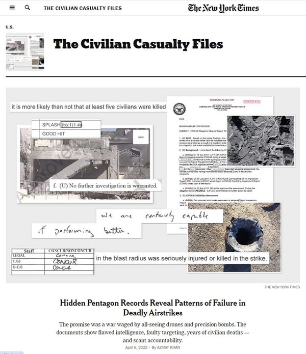 왜 미군의 전쟁은 잔인한 것일까? 한국과 베트남 전쟁에 관한 연구는 미군이 품고 있는 인종주의적 편견을 민간인 학살의 큰 원인으로 들고 있다. 최강이라는 미군이 실전에서 패배에 몰릴 때 나타나는 당혹감과 공포심 역시 민간인 무차별 학살의 심리적 원인이라고 설명하기도 한다. 주목할 것은, 2021년 12월, 뉴욕 타임스가 시리즈 특집으로 보도한 이라크와 아프간 전쟁에서의 민간인 살상 사태다(기사 사진 참조). 기사는 민간인 피해의 큰 이유로 공격 정보, 지역, 대상 등의 오류를—의도적이든, 착오든—지적하고 있다. 특히 현장에서의 실시간 판단이 거의 불가능한 공습 상황에서 큰 문제가 발생하고 있었다. 또 살상 가해자에 책임을 묻지 않는 군 내부의 풍토도 민간인에 대한 잔인한 공격이 빈발하는 배경의 하나로 지적하고 있다.