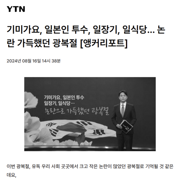 “이번 광복절, 유독 사회 곳곳에서 크고 작은 ‘논란’이 많았던 광복절로 기억될 것 같은데요, ‘논란’은 먼저 공영방송 KBS에서 시작됐죠, ...일본 국가 기미가요가 연주되는 장면이 방송되면서 ‘논란’이 됐고요...좌우가 바뀐 태극기 이미지를 사용해 ‘구설’에 오르며...”