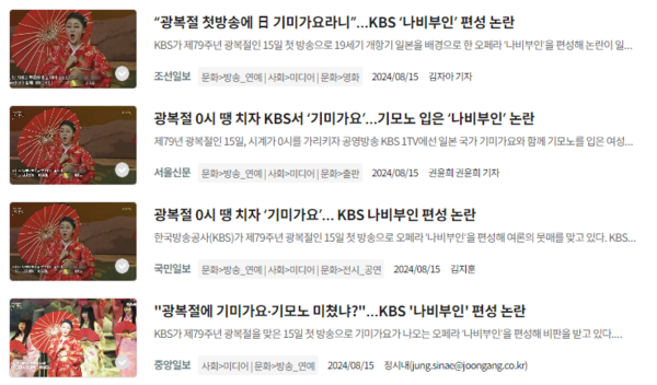 반민족적 친일 망언·망동을 ‘논란거리’로 왜곡한 것은 YTN만이 아니다. “광복절 앞두고 독립기념관장 논란, 어쩌다 이 지경 됐나”(문화일보), “잊을 만하면 터지는 윤 정부 역사 논란”(세계일보) “윤석열 정부 ‘친일’ 논란에 두쪽 난 광복절”(한겨레) “건국절 논란”(국민일보) “광복절 앞두고 정치권 친일 논란”(서울신문) “KBS ‘나비부인’ 편성 논란”(조선일보, 중앙일보, 서울신문, 국민일보) “KBS 사장, 광복절 왜색 논란 사과”(한국일보, 중앙일보) 등, 여러 주류 언론들이 윤석열 정부와 KBS의 친일 행태를 그저 ‘논란거리’로 제목을 달아 보도했다.