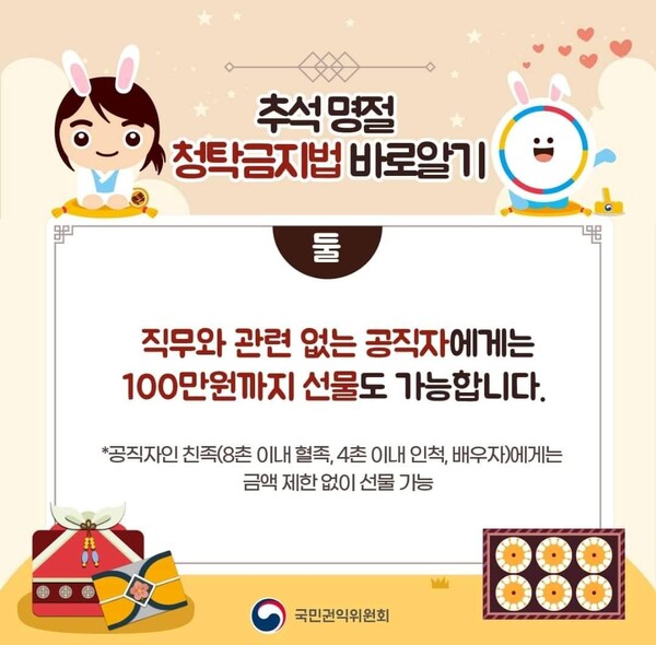 권익위는 지난 21일 '2024년 추석 명절 청탁금지법 바로알기' 카드뉴스를 제작해 홈페이지와 사회관계망서비스(SNS)를 통해 배포했다. 8장짜리 카드뉴스에는 △"누구든지 친구, 친구 등 공직자가 아닌 사람에게 주는 명절 선물은 금액 제한 없이 얼마든지 줄 수 있습니다" △"직무와 관련 없는 공직자에게는 100만원까지 선물도 가능합니다" △"공직자인 친족(8촌 이내 혈족, 4촌이내 인척, 배우자)에게는 금액 제한 없이 선물 가능" 등의 내용이 들어있다.