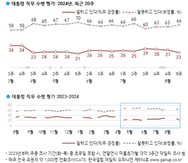 한국갤럽이 27일~29일 전국 남녀 만18세 이상 1002명을 상대로 전화면접방식으로 대통령 직무수행 평가를 조사(표본오차 ±3.1%포인트, 95% 신뢰수준, 기타 자세한 사항은 중앙선거여론조사심의위원회 홈페이지 참조)한 결과 ‘잘하고 있다’ 23%, ‘잘못하고 있다’ 66%로 응답했다. 윤 대통령의 국정운영에 대한 갤럽 조사 지지도는 3월 중 34%까지 오르기도 했으나 총선 직후 23%로 떨어진 후 지난 5월 5주차 조사에서 21%를 기록했다. 이후 소폭 상승세를 보이며 7월 3주차에는 29%로까지 올랐으나 4주차 28%, 3주간 쉰 후 실시한 8월 4주차에는 27%로 소폭 하락하다가 한 주만에 4%나 급락한 것이다.