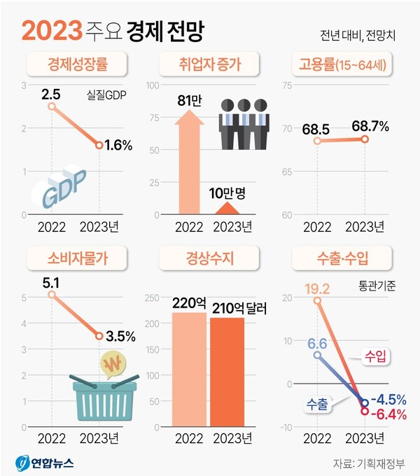 기획재정부가 21일 발표한 '2023년 경제정책방향'에 따르면 정부는 내년 실질 국내총생산(GDP) 성장률을 1.6%로 예상했다. 지난 6월 '새정부 경제정책방향'에서 제시한 전망치(2.5%)보다 0.9%포인트 낮췄다.