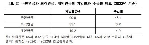 현재 개인연금과 퇴직연금은 가입률과 수급률이 국민연금과 비교해 너무 낮다. 가입률이 90%가 넘는 국민연금에 국가 보조를 확대해도 모자랄 판에 개인연금과 퇴직연금 같은 사적연금에 세제 혜택을 확대하겠다는 건 형평성에 어긋난다. 참여연대는 “사적연금의 다층체계를 구축하는 방안은 장기적으로 필요할 수는 있으나 현재로서는 국민연금의 노후 소득 보장 기능을 훼손하는 대안이 되기에는 한계가 있다”고 주장했다.