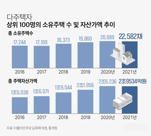 22일 더불어민주당 김회재 의원이 통계청에서 받은 '주택 소유 상위 100명의 소유 주택 현황'을 보면 지난해 11월 1일 기준 주택 소유 상위 100명은 총 2만2582채를 소유했다. 1년 전 2만689채에서 1893채(9.1%) 늘어났다.