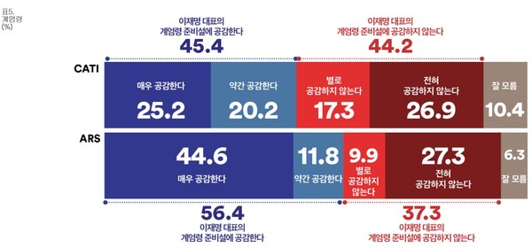 이재명 ‘계엄령 준비설’ 공감 여부, 전화면접 팽팽, ARS ‘공감’ 우세