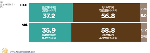 문재인 전 대통령에 대해 검찰이 뇌물수수 혐의를 적시해 수사를 시작했고, 딸 문다혜 씨에 대한 압수수색도 진행되는 가운데, 이 수사의 성격에 대해 물은 결과 전화면접조사에서는 ‘불법 정황에 대한 정당한 수사이다’ 37.2% 대 ‘정치보복이자 국면전환용 수사이다’ 56.8%, ARS조사 결과 ‘불법정황에 대한 정당한 수사이다’ 35.9% 대 ‘정치보복이자 국면전환용 수사이다’ 58.8%로 조사되어, 두 조사 모두 문다혜 씨에 대한 수사가 ‘정치보복이자 국면전환용 수사’라고 생각하는 응답자가 훨씬 많은 것으로 나타났다.