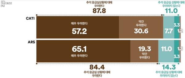 우리 국민들이 추석 연휴 중 응급실에 가야 할 때 제대로 치료 받지 못하는 상황에 대한 우려가 극도로 높은 것으로 나타났다. ‘여론조사꽃’이 9월 6일과 7일 전국 만 18세 이상 남녀 1003명(전화면접방식 조사)과 1002명(ARS 조사)을 대상으로 추석 응급실 상황에 대해 얼마나 우려하는지 물은 결과 전화면접조사에서는 ‘우려한다’ 87.8% 대 ‘우려하지 않는다’ 11.0%, ARS조사에서는 ‘우려한다’ 84.4% 대 ‘우려하지 않는다’ 14.3%로 조사(표본오차 ±3.1%포인트, 신뢰수준 95%, 기타 자세한 사항은 중앙선거여론조사심의위원회 홈페이지 참조)되었다.