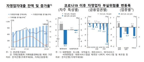 한국은행은 22일 발표한 금융안정보고서에서 앞으로 대출금리 상승세가 이어지고 매출 회복세 둔화, 금융지원정책 효과 소멸 등이 겹치면 자영업자대출 중 부실위험 규모가 내년 말 40조 원까지 확대될 것으로 추정했다. 자영업자대출은 지난 3분기 말 현재 1014조2000억 원으로 높은 증가세를 지속하고 있다. 코로나19 위기가 불거진 2020년 1분기 말에는 700조 원에 그쳤으나, 2021년 1분기 말 831조8000억 원, 2022년 1분기 말 960조7000억 원, 2분기 말 994조2000억 원에 이어 3분기 말 기준으로 사상 첫 1000조 원을 돌파했다.