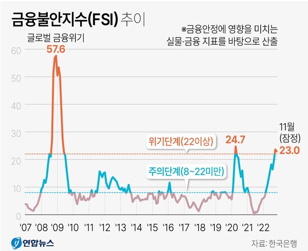 금융안정에 영향을 미치는 실물·금융 지표를 바탕으로 산출된 금융불안지수는 10월과 11월 각 23.6, 23.0으로 집계됐다. 올해 3월(8.6) 이후 9월(19.7)까지 7개월 연속 '주의' 단계(8이상 22미만)에서 꾸준히 오르다가, 결국 10월 '위험' 단계(22이상)에 들어섰고 11월에도 위험 단계에 머물고 있다.