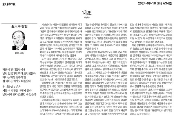 그가 9월 10일에 ‘내조’라는 제목의 칼럼을 썼다. 박근혜의 남편과 질 바이든을 떠올렸단다. 참으로 멋진 상상력이다. 확인하기는 어렵지만 김씨에 따르면 남편의 건강을 염려한 질 바이든이 남편의 재선 포기에 결정적 역할을 했단다.
