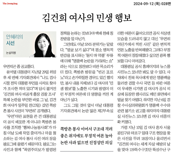 김건희 씨에 대한 중앙일보의 ‘관대함’은 그의 기괴한 행보를 ‘민생행보’로 포장하기에 이른다. 안혜리 논설위원은 이 장면을 보고 “당장 ‘대통령 같은 행세’라는 비판이 나왔다”면서 “이런저런 뒷말이 나오는 건 결국 대다수 국민이 진정성을 믿지 못하기 때문일 것이다. 민생 행보도 좋지만 사과가 우선이라는 뻔한 얘기를 또 할 수밖에 없는 이유”(‘김건희 여사의 민생 행보’ 칼럼, 9.12)라고 썼다. “쪽방촌 봉사 이어서 구조대 격려”에 나섰는데 “좋은 취지에도 부정적 여론 높아, 논란 사과 없으면 진정성만 의심”받게 될 것이라는 중간제목을 붙였다. 김건희 씨가 '민생행보'를 하는데도 욕을 먹는 게 안쓰러우니 빨리 사과하고 털고가자라는 것이다.