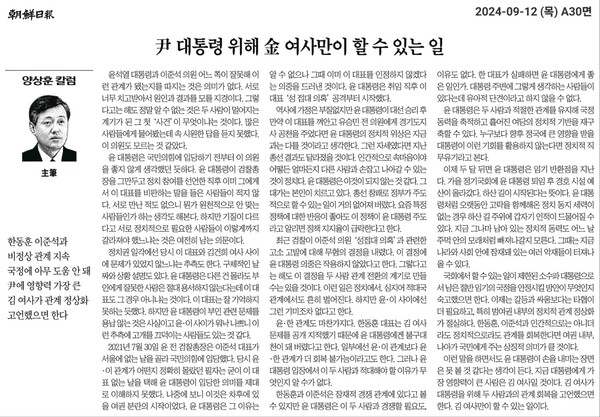 같은 날 조선일보 양상훈 주필이 쓴 ‘윤 대통령 위해 김 여사만이 할 수 있는 일’ 제목의 칼럼은 한 걸음 더 나아갔다. 온갖 추문과 의혹에도 김건희 씨가 이젠 ‘더 중요한 역할’을 해야 한다는 주문이다. 그 역할은 다름 아닌 윤석열 대통령과 한동훈·이준석 대표 사이의 갈등을 풀고 관계 회복을 위한 ‘고언’을 하라는 것이다.