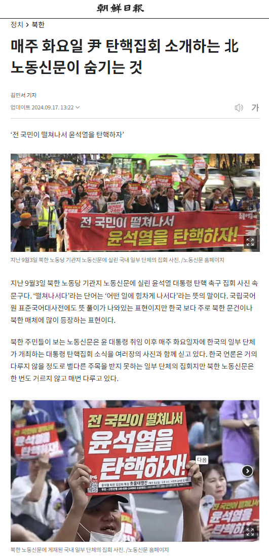 외세 아부, 전쟁 선동 조선일보의 김민서 종업원이 종이 신문이 쉬는 한가위 연휴 기간에도 ‘매주 화요일 尹 탄핵집회 소개하는 北 노동신문이 숨기는 것’이란 쓰레기사를 올렸다. ‘전 국민이 떨쳐나서 윤석열을 탄핵하자’라는 손팻말 문구가 노동신문에 실렸단다. ‘떨쳐 나서다’는 말이 국립국어원에 뜻풀이가 나와 있지만 주로 북에서 많이 등장하는 표현이라는 설명도 덧붙였다. 치졸한 색깔 공세가 2024년 백주 대낮에 대한민국에서 행해지고 있다. 이런 자들이 언론인이랍시고 우글대는 조선일보가 언론 행세를 하고 있으니 기가 막힐 노릇이다.