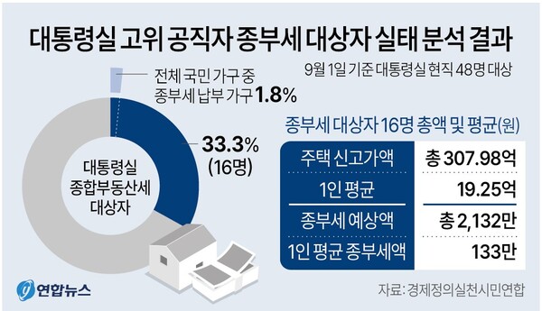 경제정의실천시민연합(경실련)은 26일 서울 종로구 경실련 강당에서 기자회견을 열고 대통령실 고위공직자 부동산 보유 현황과 종부세 대상자 실태를 분석해 발표했다. 올해 1월 재산을 공개한 70명 중에 지난달 1일 기준 현직에 있는 48명을 대상으로 조사했다. 그 결과 16명(33.3%)이 종부세 대상자로 추정됐다. 이들의 종부세 대상 주택 신고가액은 총 307억 9840만 원으로 1인당 평균 19억 2490만 원이었다. 이에 따른 종부세 예상액은 총 2132만 원(1인 평균 133만 원)인 것으로 집계됐다.
