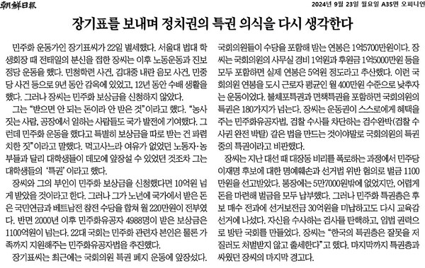 아무리 조선일보라 해도 사자(死者)까지 이용해 값싼 짓을 하지는 않겠지 생각했지만, 역시 실망하게 하지 않는다. 조선일보는 9월 23일에 ‘장기표를 보내며 정치권의 특권 의식을 다시 생각한다’는 사설을 내보냈다. 이 사설에서 조선일보는 고인이 민주화 운동의 상징적 존재였고 평생 민주화 운동을 했으며 최근에는 국회의원 특권 폐지 운동을 전개했다고 소개한다. 특히 민주화 보상금을 신청하지 않았음을 강조하고 있다.
