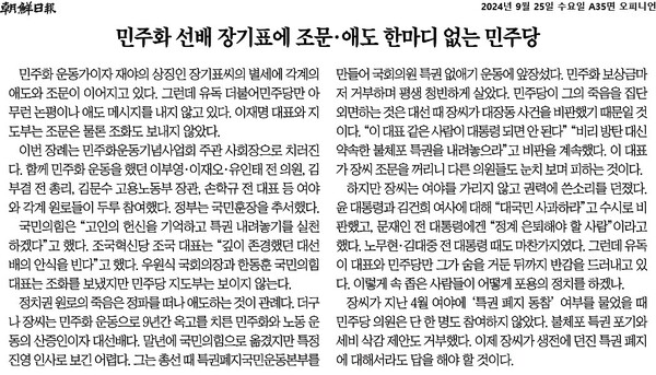 조선일보가 아무래도 성이 차지 않았던 듯하다. 9월 25일에는 ‘민주화 선배 장기표에 조문, 애도 한마디 없는 민주당’이 사설 제목이다. 처음부터 끝까지 민주당과 이재명 대표를 비난하는 내용이다. 각계의 애도와 조문이 이어지는 가운데 민주당과 이재명 대표만 아무런 메시지를 내지 않고 조문도 하고 있지 않단다. 이제는 조문도 애도도 조선일보 눈치를 보아야 하는 세상이다.