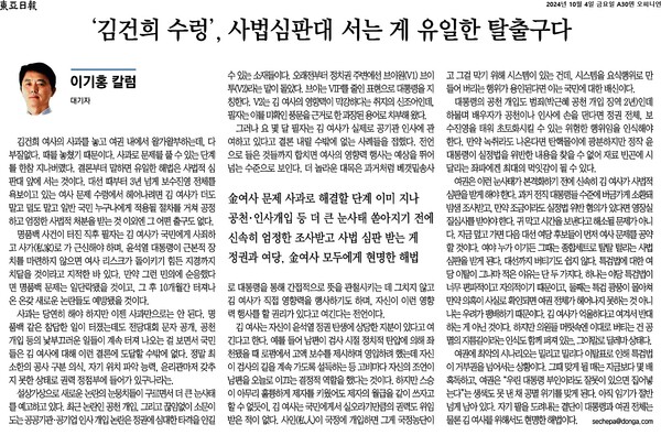 조선일보 아류 매체 가운데 그나마 윤 정권에 ‘덜 호의적인’ 논조였던 동아일보가 김건희 씨로 인해 비롯된 수구 혹은 ‘보수’ 세력 붕괴의 불안을 가장 극적으로 표출했다. 동아일보는 4일 “‘김건희 수렁’, 사법심판대 서는 게 유일한 탈출구”(이기홍 칼럼)에서 “김건희 씨 문제의 유일한 해법은 사법적 심판대 앞에 서는 것”이라면서 “김 여사가 더도 말고 덜도 말고...엄정한 사법적 처분을 받는 것 이외엔 그 어떤 출구도 없다”고 단언하고 나섰다.