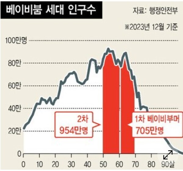 일반적으로 베이비부머 세대란 해방 직후인 1946년부터 가족계획 정책이 시행된 1963년까지 태어난 세대를 말한다. 현재 60~70대이며 740만 명 정도 된다. 베이비붐 현상 이후 태어난 1964∼1974년생을 2차 베이비부머 세대라고 한다. 이들은 우리나라 전체 인구의 18.6%를 차지하는 964만명으로 단일 세대 규모 중 가장 크다. 이들이 올해부터 법정 은퇴연령(60세)에 진입하는데, 이들이 생산 현장을 떠날 경우 연간 경제성장률이 하락할 정도로 대한민국 경제에 미치는 영향이 크다. 1000만 명에 육박하는 2차 베이비부머 은퇴를 ‘쓰나미(해일)’에 비유하는 이유다.