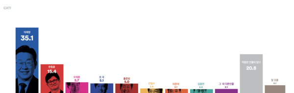 차기 대권주자 선호도 이재명 압도적 1위, 한동훈의 2~2.5배