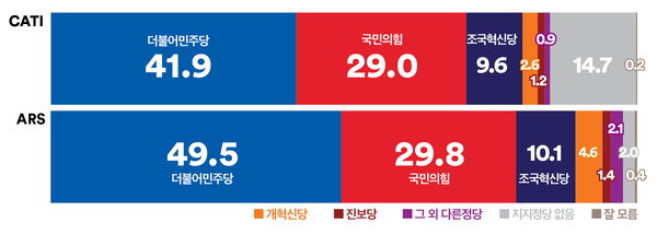 정당 지지율에 대한 전화면접조사에서는 민주당이 지난 조사 대비 0.6%p 하락한 41.9%, 국민의힘은 2.2%p 상승한 29.0%, 조국혁신당은 0.3%p 상승한 9.6%로 조사됐고, ARS조사에서도 민주당은 지난주보다 2.4%p 하락한 49.5%, 국민의힘은 4.3%p 상승한 29.8%, 조국혁신당은 0.8%p 하락한 10.1%로 조사되었다.