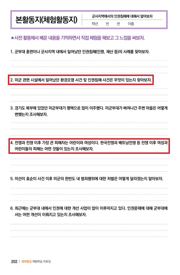 아울러 해당 단원 뒤에 제시한 예시용 '체험활동지'에는 "미군 관련 시설에서 일어났던 환경오염 사건 및 인권침해 사건은 무엇이 있는지 찾아보자"라거나 "한국전쟁과 베트남전쟁 등 전쟁 이후 여성과 어린이들의 피해는 어떤 것들이 있는지 조사해보자" 등 군부대 주변에서 벌어지는 인권 문제에 대해 학생이 스스로 학습할 수 있도록 과제를 제시하고 있다.