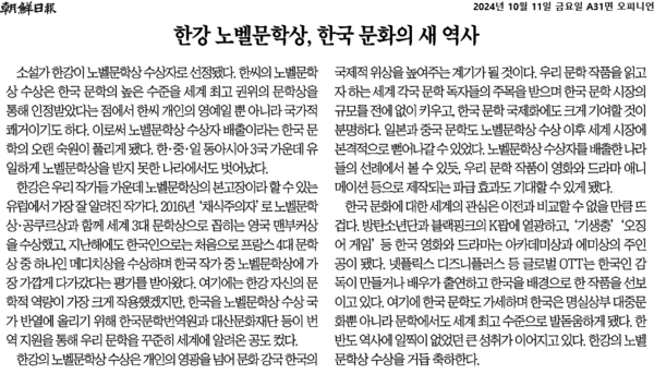 조선일보는 한강 작가 노벨문학상 수상을 어느 언론 못지 않게 크게 보도했을 뿐 아니라 “한강 노벨문학상, 한국 문화의 새역사” 제하 사설(11일자)에서 “한 씨의 수상은 한국 문학의 높은 수준을 세계 최고 권위의 문학상을 통해 인정받았다” “국가적 쾌거”라고 칭송하고 “한강의 노벨문학 수상을 거듭 축하한다”고도 했다.