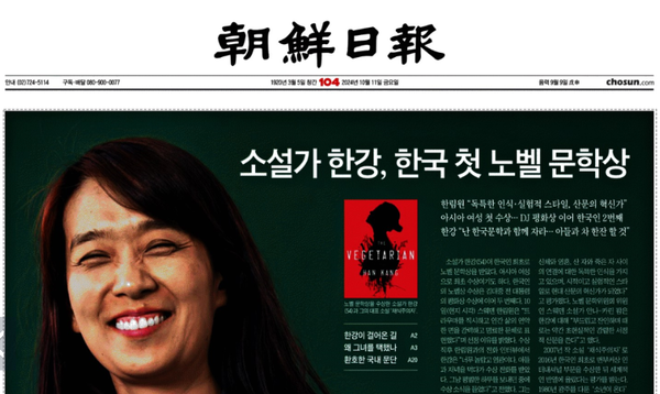 조선일보는 한강 작가 노벨문학상 소식이 알려진 직후 이틀 동안 1면 톱과 주요면에서 한강 작가 노벨상 수상 소식을 다뤘다. 11일에는 “소설가 한강, 한국 첫 노벨 문학상”(1면 톱) “아버지·오빠도 작가…시로 등단해 소설로 방향 틀어”(2면 톱) “스웨덴 한림원 ‘역사적 트라우마에 맞선 강렬한 시적 산문”(3면 톱), “한강 노벨문학상, 한국 문화의 새 역사”(사설) 등의 기사와 사설을 실었다. 12일에도 “한강 신드롬 대한민국이 종일 웃었다”(1면 톱), “한강 문학이 세계 시민의 언어 될 수 있음을 보여줘”(2면 톱), “한강, 5.18과 4.3 배경으로 인간 탐구…역사성·문학성 인정받아”(3면 톱) 등으로 지면을 가득 채웠다.